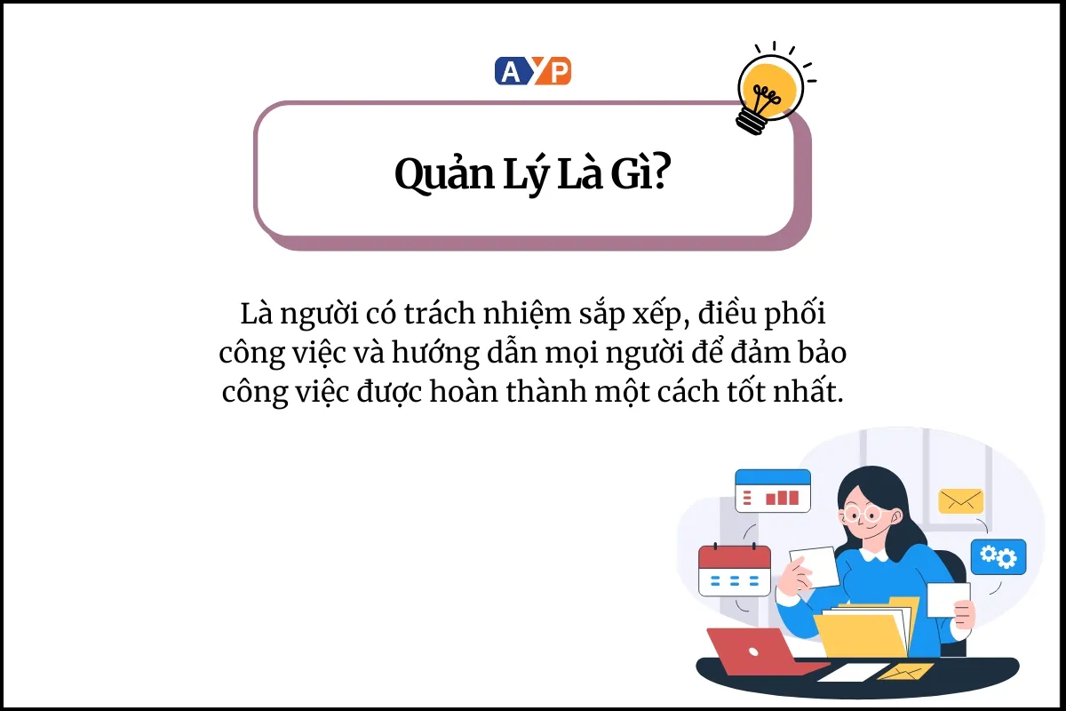 Quản lý là người có trách nhiệm sắp xếp, điều phối công việc và hướng dẫn mọi người để đảm bảo công việc được hoàn thành một cách tốt nhất.